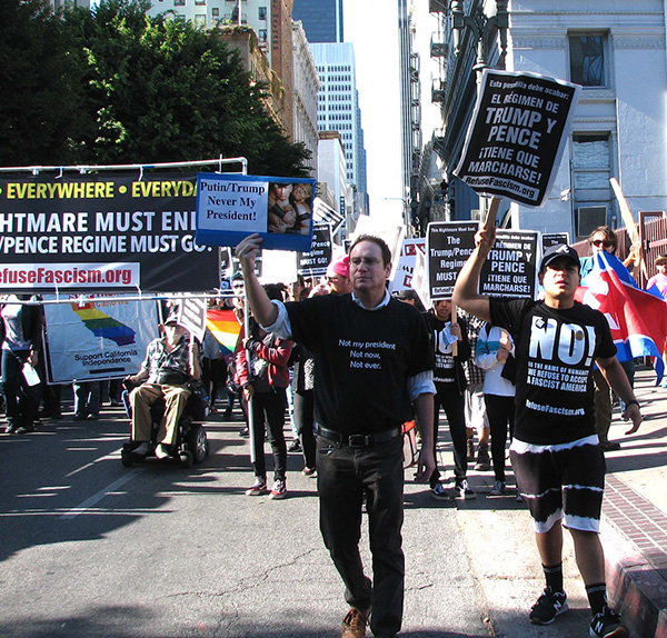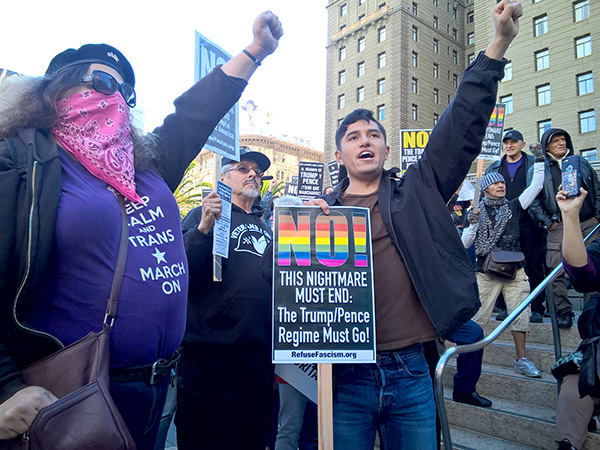 Nos dias que antecederam o 4 de Novembro houve uma intensa batalha com as autoridades municipais em relação à autorização do protesto, a qual foi escandalosamente negada. Apesar disso, pelo menos 300 pessoas estiveram presentes numa concentração na Praça de União, no centro da zona comercial da cidade, e mais de 400 estiveram presentes no pico da manifestação de mais de 6 quilómetros que percorreu os bairros Castro e Misión. Entre os oradores na concentração esteve um representante da La Colectiva; Steve Rapport, membro da Indivisible [Indivisível] de São Francisco e ativista pela impugnação de Trump; um estudante da Universidade da Califórnia em Berkeley; Christina DiEdoardo, ativista dos direitos civis e jornalista do Bay Area Reporter.