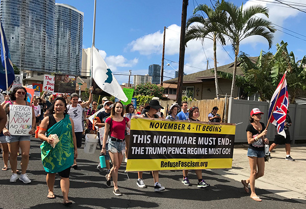 Cerca de 250 pessoas saíram às ruas de Honolulu numa animada manifestação por algumas das ruas mais movimentadas da cidade. Era uma mistura incrivelmente diversificada. Crianças muito novas gritavam orgulhosamente “Não a Trump, Não ao KKK, Não a uns EUA fascistas” ao lado de manifestantes com mais de 80 anos. Os participantes eram de todas as etnias e raças — e alguns deles eram visitantes de outros países. A maioria deles trouxe os seus próprios cartazes criativos feitos à mão que refletiam os pesadelos listados no Apelo Para o 4 de Novembro. Outros trouxeram bandeiras. Bandeiras em arco-íris esvoaçavam ao lado de bandeiras da Coreia, de Porto Rico e do Havai, e entre elas não havia nenhuma bandeira norte-americana.