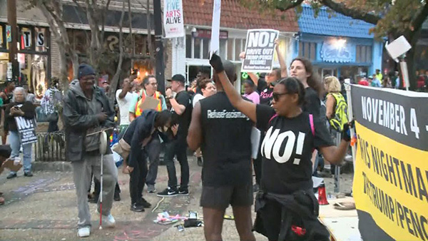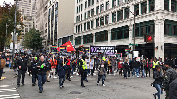 A concentração e manifestação de cerca de 175 pessoas foi muito animada, apesar da chuva. Cerca de 30 fascistas, alguns deles armados, tentaram perturbar o evento, mas sem sucesso. Estiveram presentes muitas pessoas apesar de saberem das ameaças dos fascistas, e outras juntaram-se-lhes nesse momento. Era uma multidão muito diversificada em idades e nacionalidades. Quando os organizadores andavam entre a multidão com um microfone para as pessoas falarem, um sem-teto disse: “O meu pesadelo é que este pesadelo não acabe.” Outras pessoas falaram sobre Trump se ter vangloriado de agressões sexuais e ataques às pessoas LGBTQ. Uma das pessoas que falou foi a tia de Jamarion Robinson, atingido 76 vezes pela polícia.