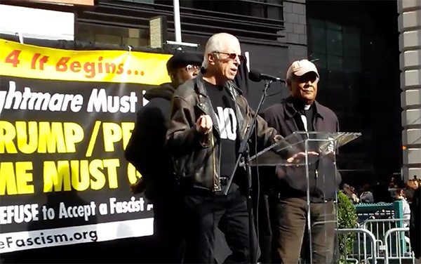 A concentração que deu início aos eventos do dia deu um vislumbre da diversidade de pessoas que tinham dado um passo em frente para participar, bem como uma forte orientação para todos os que estavam presentes. Sunsara Taylor e Jam No Peanut foram os MCs [mestres-de-cerimónias] e Jay W.Walker, membro do comité dirigente da Recusar o Fascismo e iniciador da Gays Against Guns [Homossexuais Contra as Armas], falou sobre a Recusar o Fascismo de Nova Iorque. Foram lidas emotivas declarações de solidariedade de Eve Ensler, de Gloria Steinem e do compositor e músico galardoado com um Prémio Grammy Arturo O'Farrill. Iman Souleimane Konate falou em nome da comunidade muçulmana. Andy Zee, co-iniciador da Recusar o Fascismo, fez o discurso principal e o artista rap Immortal Technique fez uma curta intervenção e declamou um poema. Também falou o Padre Luis Barrios, da Igreja Holyrood/Iglesia Santa Cruz e do Colégio John Jay da Universidade da Cidade de Nova Iorque. E houve declarações de estudantes do ensino secundário e universitário. Do palco, a liderança projetou a seriedade deste momento, o que as pessoas ali presentes (e em todo o país) queriam fazer, porque é que isto é o que tem de ser feito para expulsar este regime e a determinação e confiança de que é possível fazê-lo.