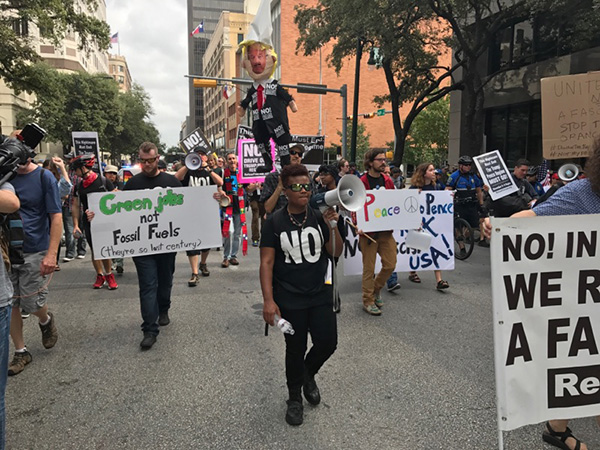 Todo o evento foi um intenso enfrentamento. Mas os organizadores da manifestação, os MCs e os participantes conseguiram manter-se focados no objetivo do dia: iniciar um processo que pode transformar os milhares de pessoas que hoje saíram às ruas em todo o país em dezenas de milhares e finalmente em milhões, mantendo-se nas ruas até porem fim ao pesadelo. Vários oradores contribuíram para a concentração, entre os quais: um pastor protestante, um jovem de Austin, uma mulher da classe média no primeiro protesto dela, um homem que levou a multidão a cantar uma poderosa canção antifascista, um professor do ensino secundário que condenou os ataques fascistas ao ensino público, um outro jovem professor que, de uma maneira apaixonada e visceral, fez com que a atenção de toda a gente se focasse nas pessoas que, em todo o planeta, já foram assassinadas ou vitimizadas pelo regime de Trump e Pence. Tudo isto face a uma furiosa turba de fascistas e fileiras de polícias.