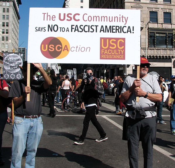 Havia uma forte presença de pessoas religiosas — entre as quais aqueles que fizeram declarações como o reverendo Frank Alton da Igreja Episcopal de São Athanasius, o padre Richard Estrada e o reverendo Tom Carey, ambos da Igreja da Epifania. Outras das pessoas que falaram na concentração foram: Cindy Sheehan, cujo filho morreu no Iraque; Graywolf, diretor da AIMSoCal (Movimento Índio Norte-Americano, Sul da Califórnia); e Isabel Cardenas, ativista salvadorenho-americana e uma das iniciadoras da Recusar o Fascismo.