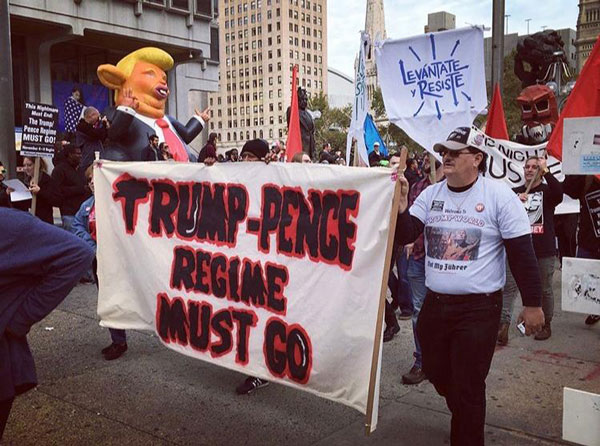 E enfrentando um silenciamento mediático até poucos dias antes dos protestos — mesmo assim as pessoas estiveram presentes. Por vezes às centenas ou mais, por vezes apenas um punhado de pessoas animadas — a 4 de novembro quatro mil pessoas em mais de uma vintena de cidades saíram às ruas como força determinada a ACABAR com o fascismo de Trump e Pence.