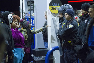 Os manifestantes regressaram ao posto de gasolina onde começaram confrontos entre os manifestantes e as linhas da polícia de choque. As autoridades mobilizaram a Polícia Municípal e a Patrulha Rodoviária do Missouri, bem como polícias de cidades vizinhas. Vários manifestantes foram presos e outros foram atacados com gás. Não houve só jovens, mas também pessoas mais velhas do bairro que saíram e ficaram no local. Um homem mais velho falou com orgulho sobre como os jovens que ele conhecia se tinham erguido correcta e militantemente perante a polícia na noite anterior.